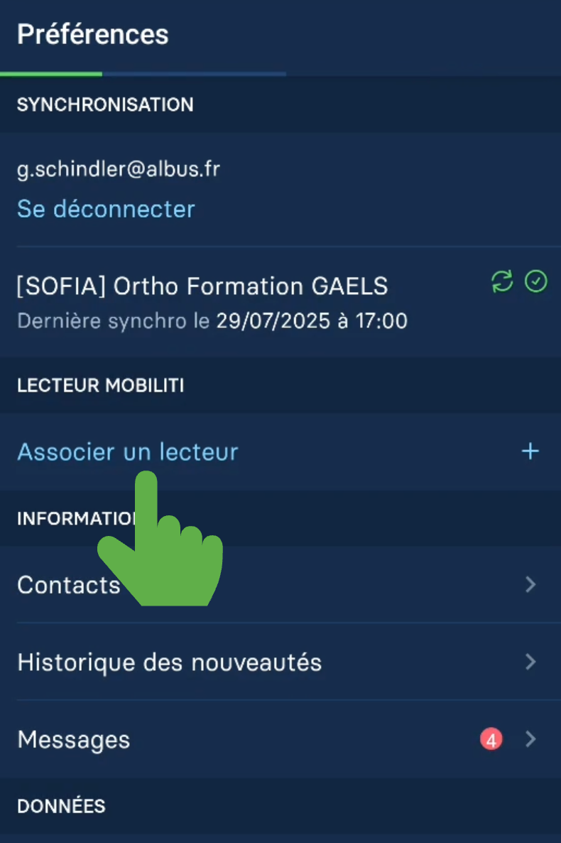 Débranchez le lecteur de l'ordinateur puis ouvrez l’application Mobiliti, rendez vous dans le menu Préférences en bas à droite de l’écran. Appuyez sur Associer un lecteur.