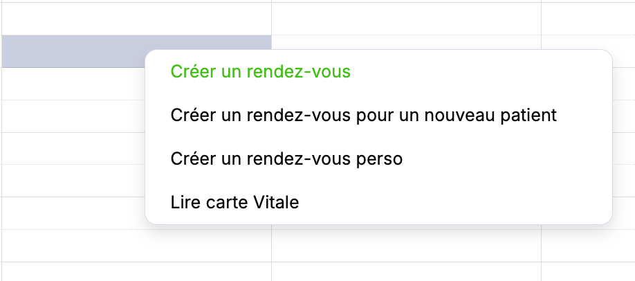 Il est possible grâce au clic droit de la souris, d’ajouter un nouveau rendez-vous ou de lire la carte Vitale. Ce clic droit permet aussi de déplacer ou de supprimer un rendez-vous déjà pris mais également d’accéder aux informations du patient plus rapidement (sa fiche patient ou sa prescription).