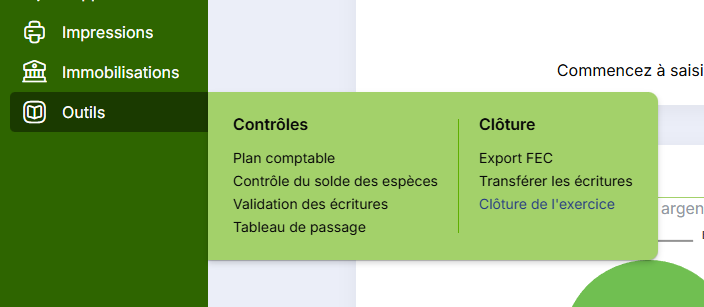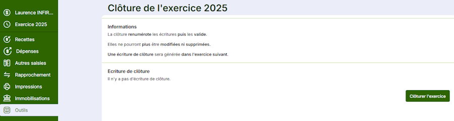 Si vous souhaitez clôturer un exercice, vous pouvez le faire depuis le menu Outils dans le module Compta.