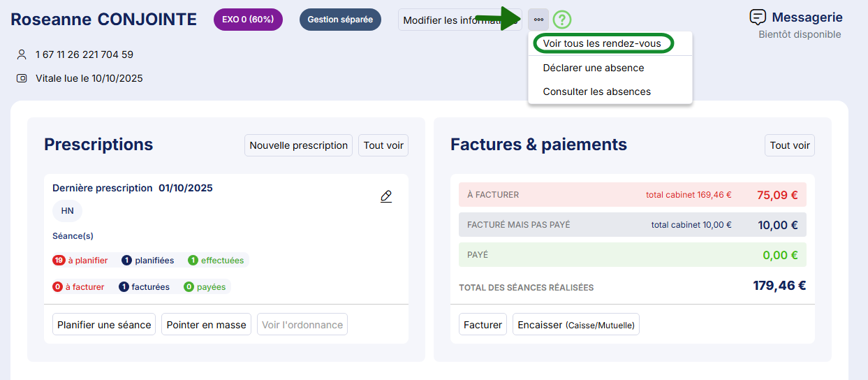 Pour les consulter, rendez vous sur la fiche du patient et cliquez sur "Voir tous les rendez-vous" depuis le haut de la fiche