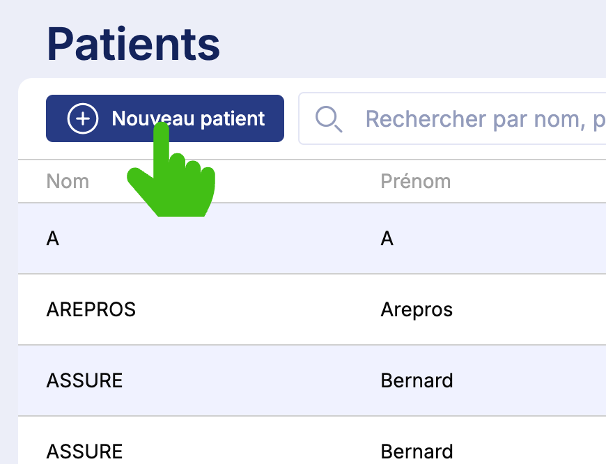 1. Pour créer la fiche du patient, ouvrez le menu Patients puis cliquez sur le bouton Nouveau.