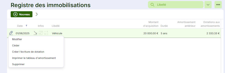Le crayon à côté de chaque immobilisations permet de modifier, céder (dans le cas d'un véhicule), Imprimer le tableau d'amortissement ou de supprimer l'immobilisation.