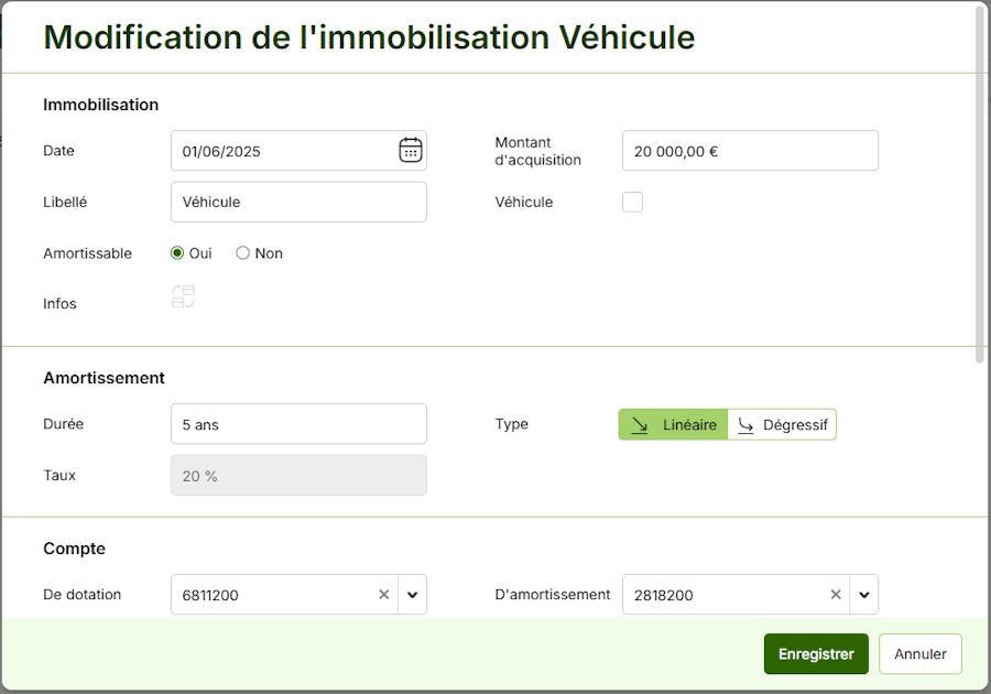 Veuillez remplir les champs Date, Libellé, Montant et cochez la case d'acquisition véhicule quand c'est le cas. Enfin, cochez oui pour Amortissable.
