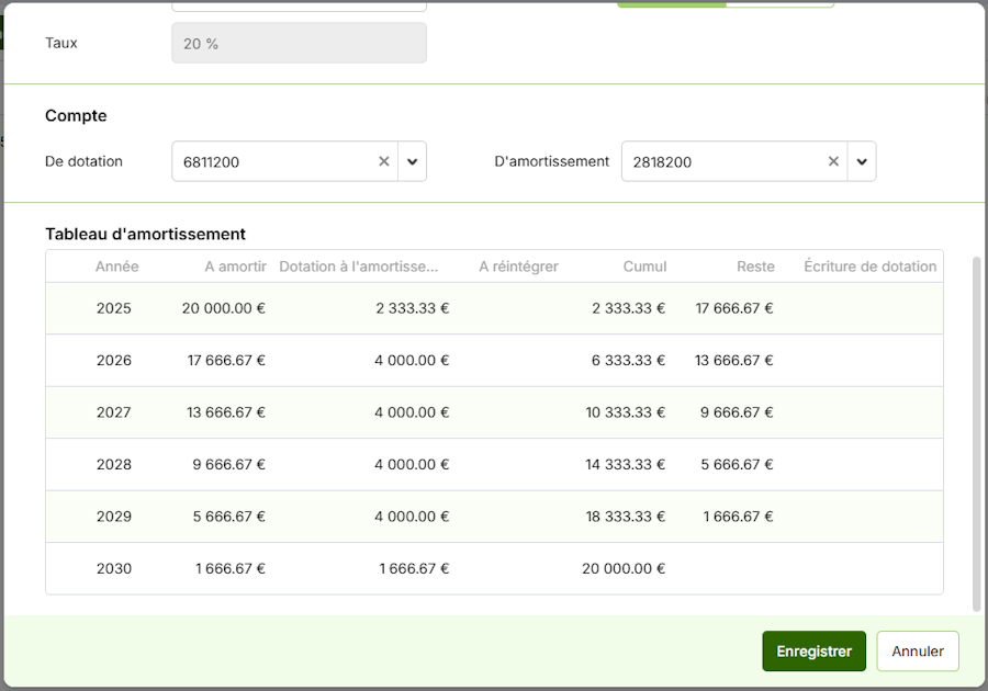 Un tableau d'amortissement apparait pour voir le résultat année après année. Pour finir cliquez sur Enregistrer.