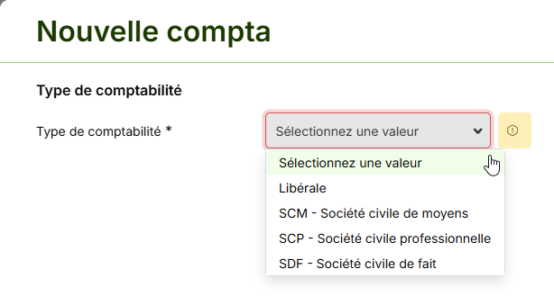 Choisissez le type de votre comptabilité parmi Libérale ou Société Civile...