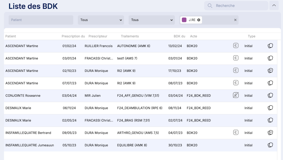 La liste des BDK apparait, n’hésitez à utiliser les champs de recherche pour filtrer et trouver facilement le nombre de bilan pour vos patients ou bien de voir s’ils sont facturés ou non.