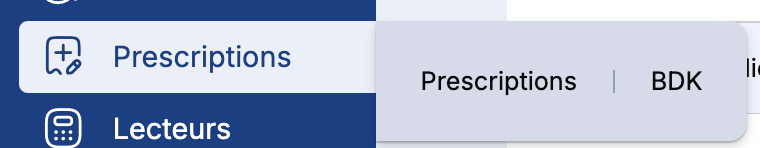 Pour voir la liste des BDK de tous vos patients, passez la souris sur Prescriptions puis cliquez sur BDK :