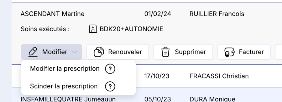Depuis la liste des prescriptions du patient que vous retrouvez en cliquant sur Consulter prescriptions depuis la fiche du patient, en cliquant sur le bouton Modifier, vous avez deux options : Modifier la prescription et Scinder la prescription.