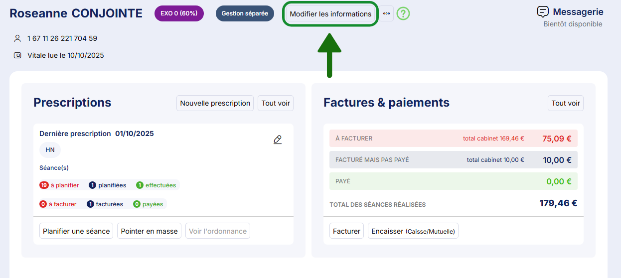 Afin de rendre inactif un patient, rendez-vous tout d'abord sur sa fiche et cliquez sur Modifier les informations.