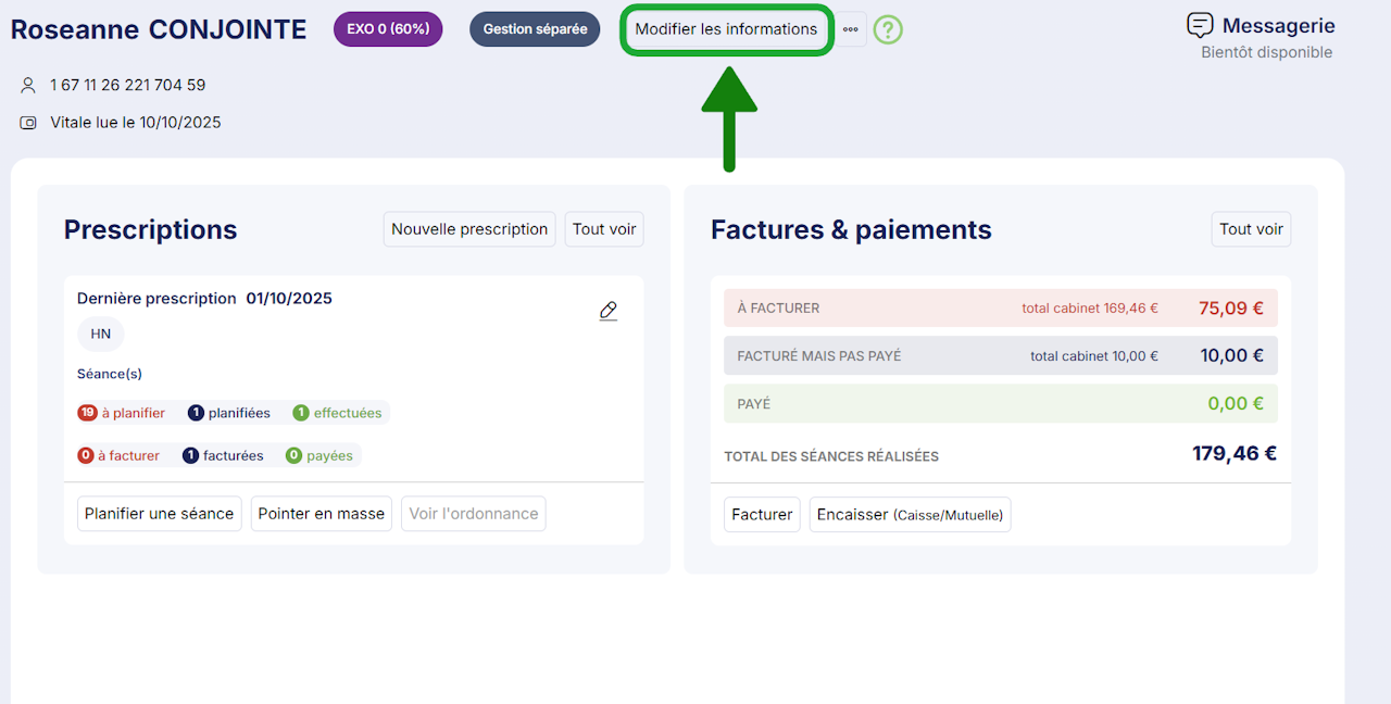 Commencez par vous rendre sur la fiche de votre patient puis cliquez sur Modifier les informations