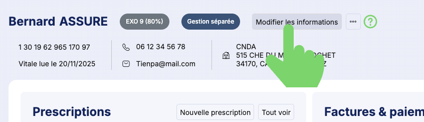 Cliquez sur le patient depuis le menu Patients pour ouvrir son dossier.